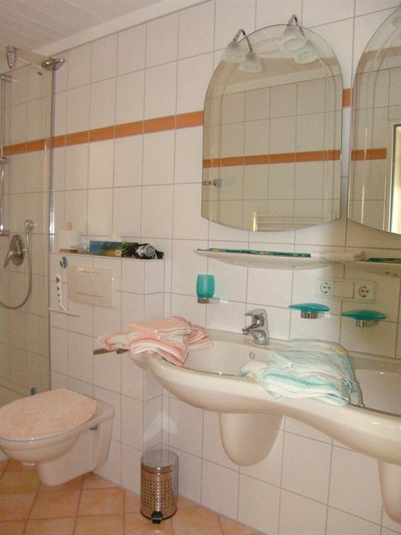 . Badezimmer mit Doppelwaschbecken und Dusche/ WC und Fenster